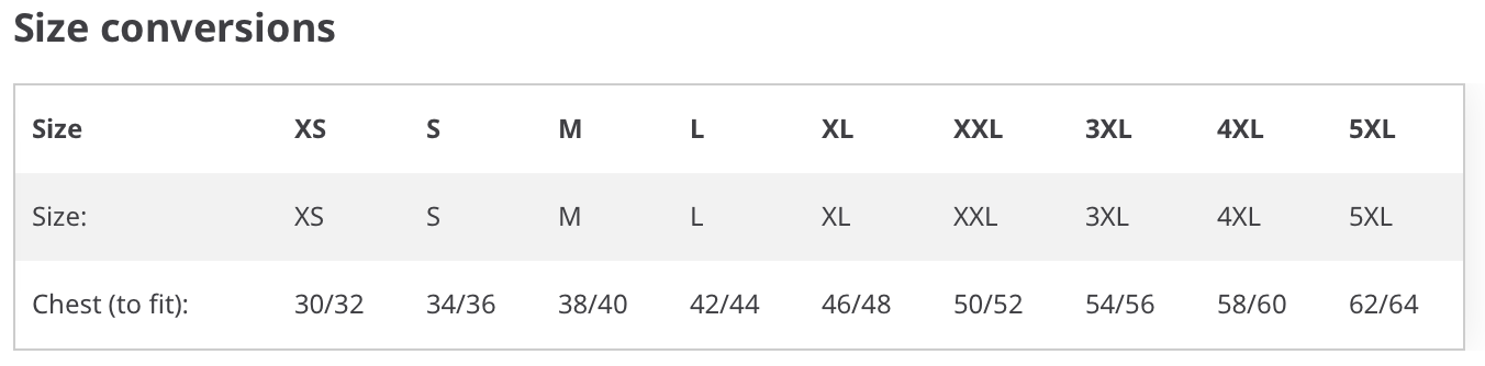 | Chest (to fit) | 34/36 | 38/40 | 42/44 | 46/48 | 50/52 | 54/56 | 58/60 | 62/64 |
